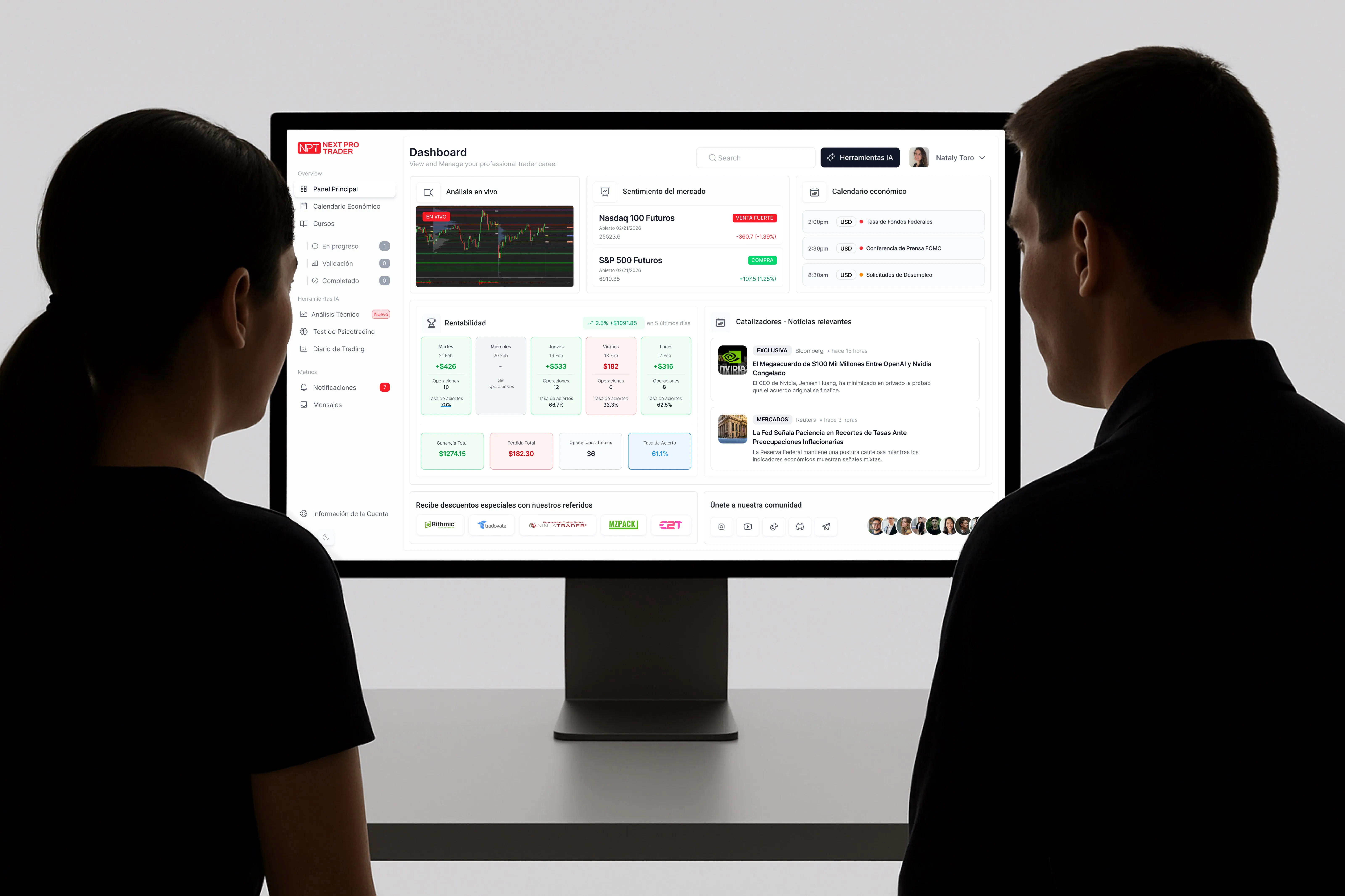 NextProTrader es la plataforma No. 1 de habla hispana, estructurada y enfocada exclusivamente en el mercado de futuros Nasdaq (NQ) y S&P 500 (ES) — construida alrededor de metodología, inteligencia artificial y disciplina profesional.